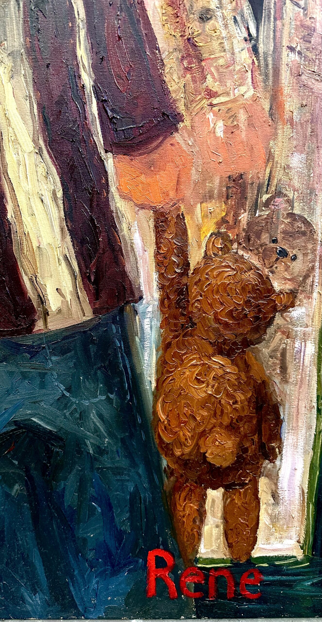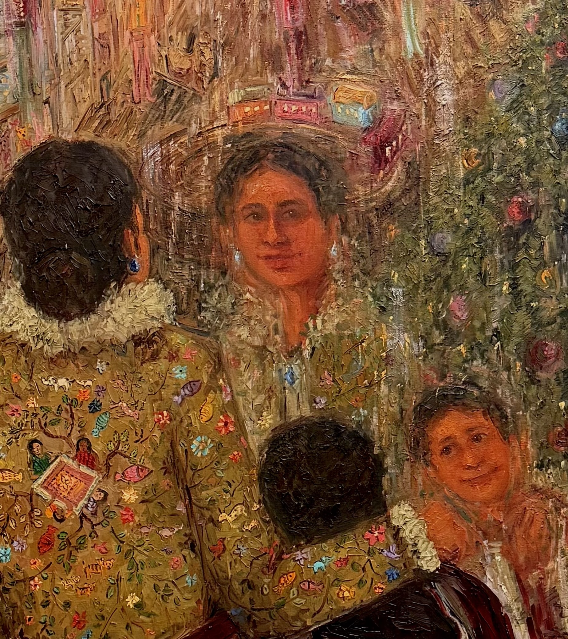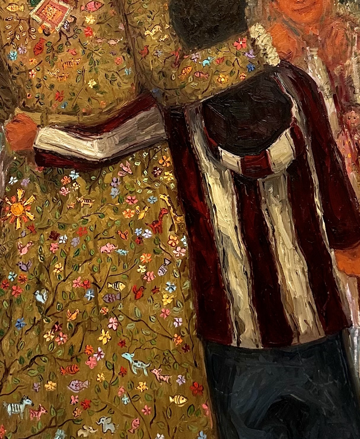The artwork depicts the tactile aspects of relationships (in this case, that of a mother and child), using the brush strokes of fabric of their clothes melting into one another as they put their arms around each other. Even though physicality and proximity are an important compositional element in my work- the textured materiality of strokes merging and melting into one another represents a sort of bond that goes beyond just the flesh.